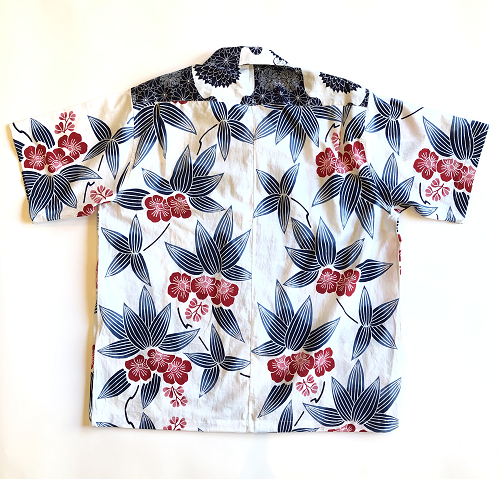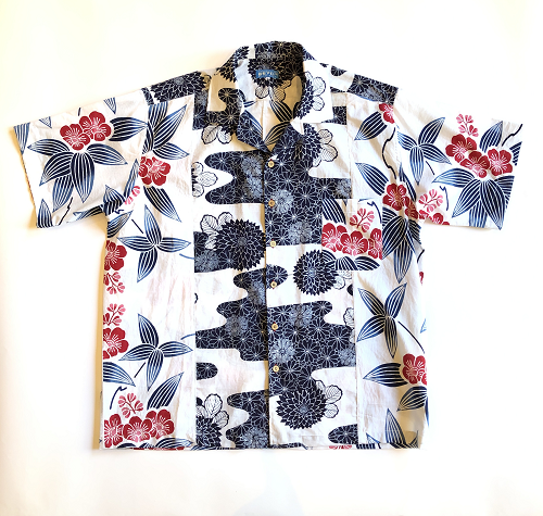 特価!赤い花と菊花の浴衣地アロハシャツ(3Lサイズ)【和柄】