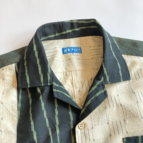 格子とよろけ縞の白黒紬地アロハシャツです。